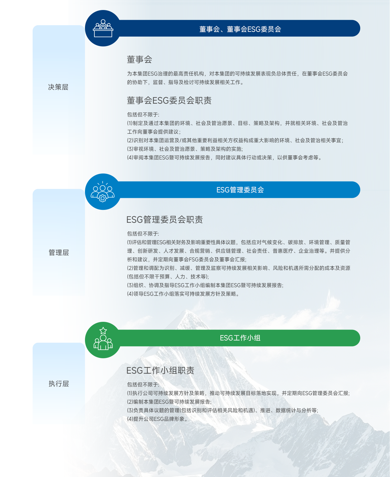 ag尊龙凯时·人生就是博医药集团构建了由董事会及董事会ESG委员会、ESG管理委员会、ESG工作小组组成的ESG治理架构,以确保董事会及管理层对可持续发展的有效监管、科学指导及全力支持。